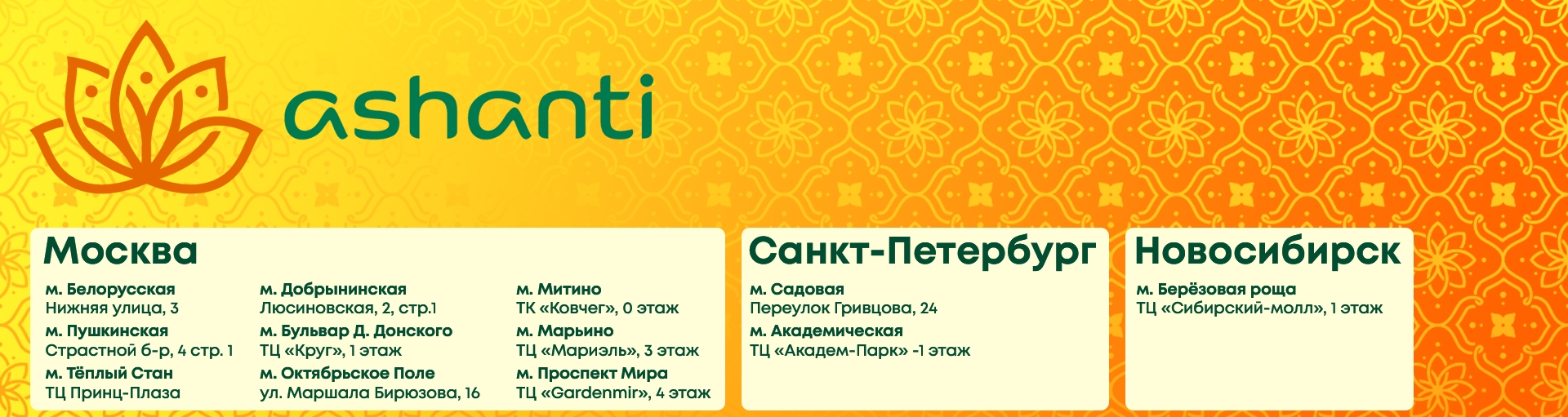 Зайдя в магазин «Ашанти», всегда можно найти интересующий товар по доступной цене. Предлагаемая покупателям продукция – только натуральная и высокого качества. Другие преимущества: