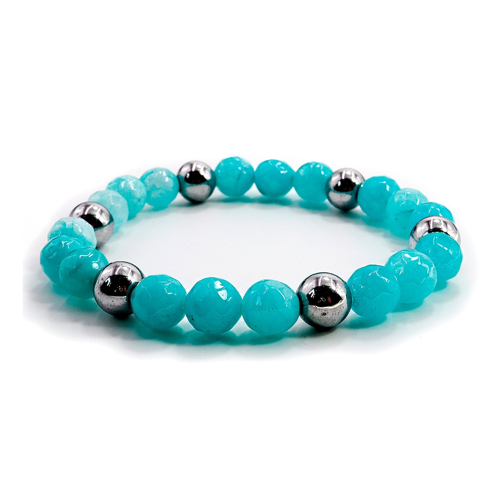 Браслет собран из бусин натурального бирюзового агата диаметром 8 мм. Этот камень известен своей слоистой структурой и способностью уравновешивать эмоциональное состояние.