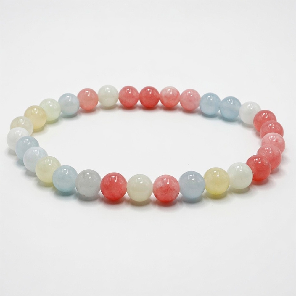 Браслет собран из трёх природных минералов: лунного камня, берилла и розового кварца. Диаметр бусин — 6 мм.