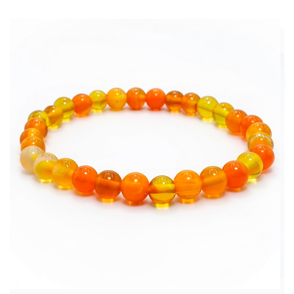 Браслет из натурального желтого агата. Диаметр бусин — 6 мм. Камень относится к слоистым халцедонам с равномерной, спокойной энергетикой.