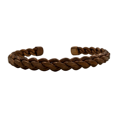 Медный браслет выполнен в технике плетенки. Одно цельное изделие без замка и застежек. Медь соответствует стандарту М1 (чистота от 99.9%).
