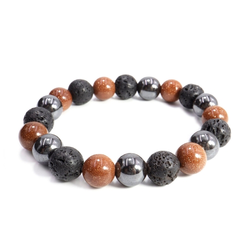 Браслет скомбинирован из трёх материалов: каменная лава, гематит и авантюрин. Лава обладает пористой структурой и легким весом. Гематит известен металлическим блеском и свойствами магнитного камня. Авантюрин отличается включениями с эффектом мерцания.
