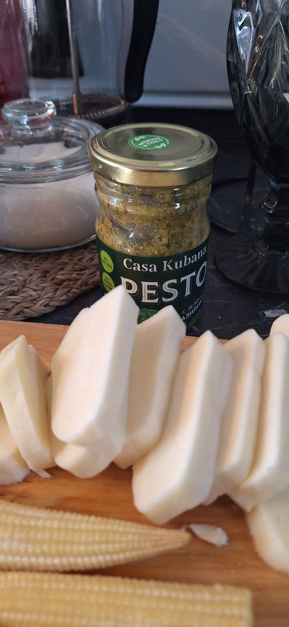 Масло подсолнечное рафинированное дезодорированное, базилик свежий, вода питьевая, ядра орехов кешью, пюре картофельное сухое, дрожжевой экстракт, соль морская пищевая, натуральное пищевое волокно, масло оливковое нерафинированное высшего качества (Extra virgin olive oil), чеснок сушёный, ядра кедрового ореха, регуляторы кислотности (лимонная кислота, молочная кислота).