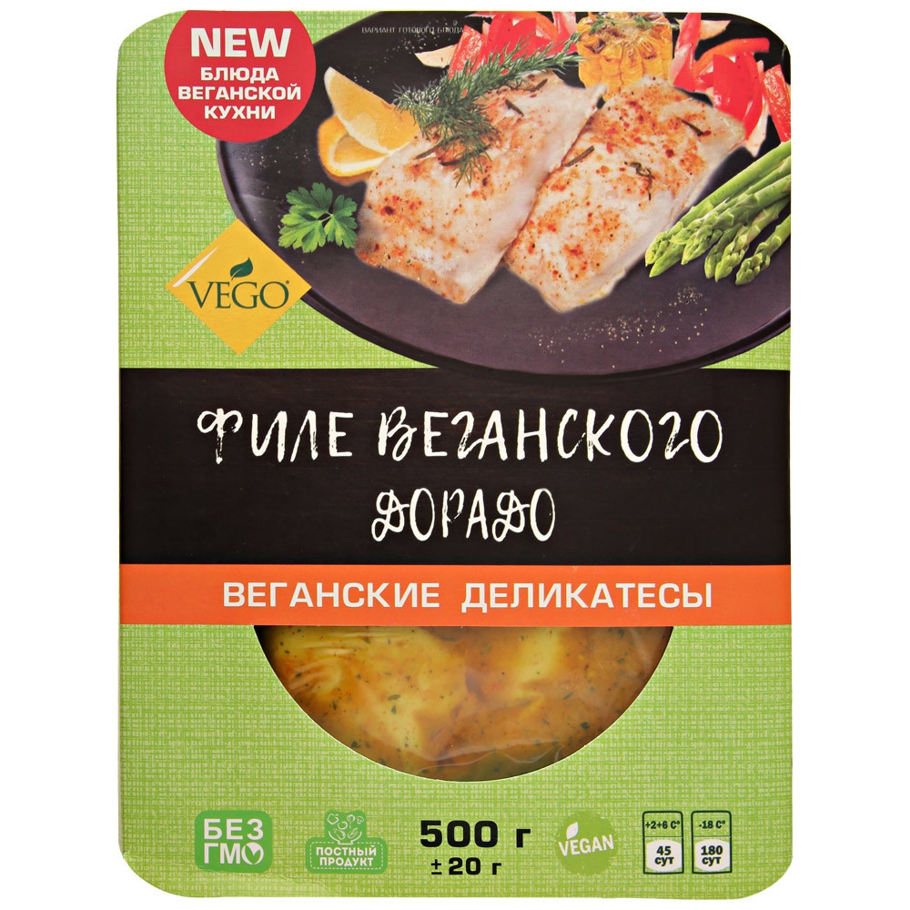 Филе «Веганский дорадо» – натуральный продукт из растительных ингредиентов, идеально имитирующий внешний вид и вкус рыбы. Он изготовлен на основе сейтана (пшеничного белка и овсяной муки), сдобренный пряными специями. Аромат настоящей рыбы ему придает натуральный ароматизатор, морская соль. Для более насыщенного вкуса в филе включили орегано, сладкую паприку, куркуму и имбирь, которые оказывают дополнительную пользу для организма. Оно получается очень сочным, сытным, его можно обжаривать на сковороде, готовить в духовке. Оно отлично сочетается с любыми соусами и заправками. Его можно употреблять на диете, в пост.