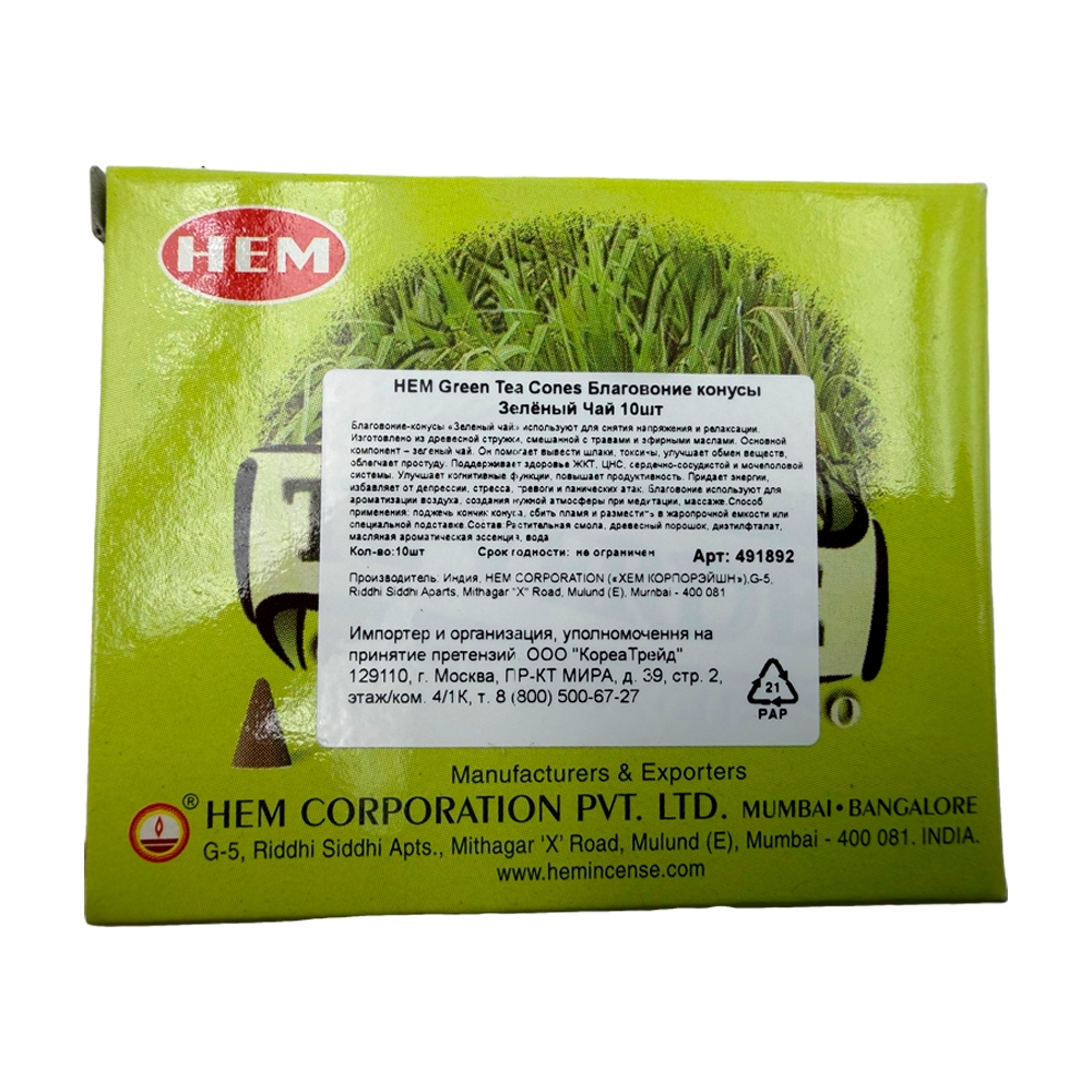 HEM Green Tea Cones Благовоние конусы Зелёный Чай 28г