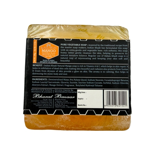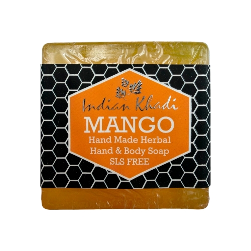 Мыло INDIAN KHADI Soap Mango создано на основе натурального мыльного основания и масла манго. Формула не содержит лаурилсульфата натрия (SLS), парабенов и искусственных красителей.