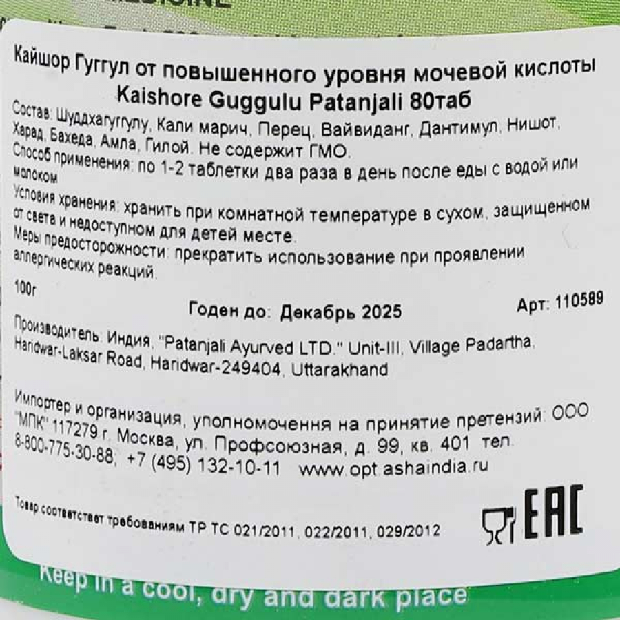Кайшор Гуггул (Kaishore Guggulu) от повышенного уровня мочевой кислоты от Patanjali | Патанджали 80 таблеток - препарат широкого спектра действия на основе целебных трав. Аюрведические растения в составе средства очищают кровь, улучшают работу почек и выделительной системы человека, оздоравливают и защищают печень.