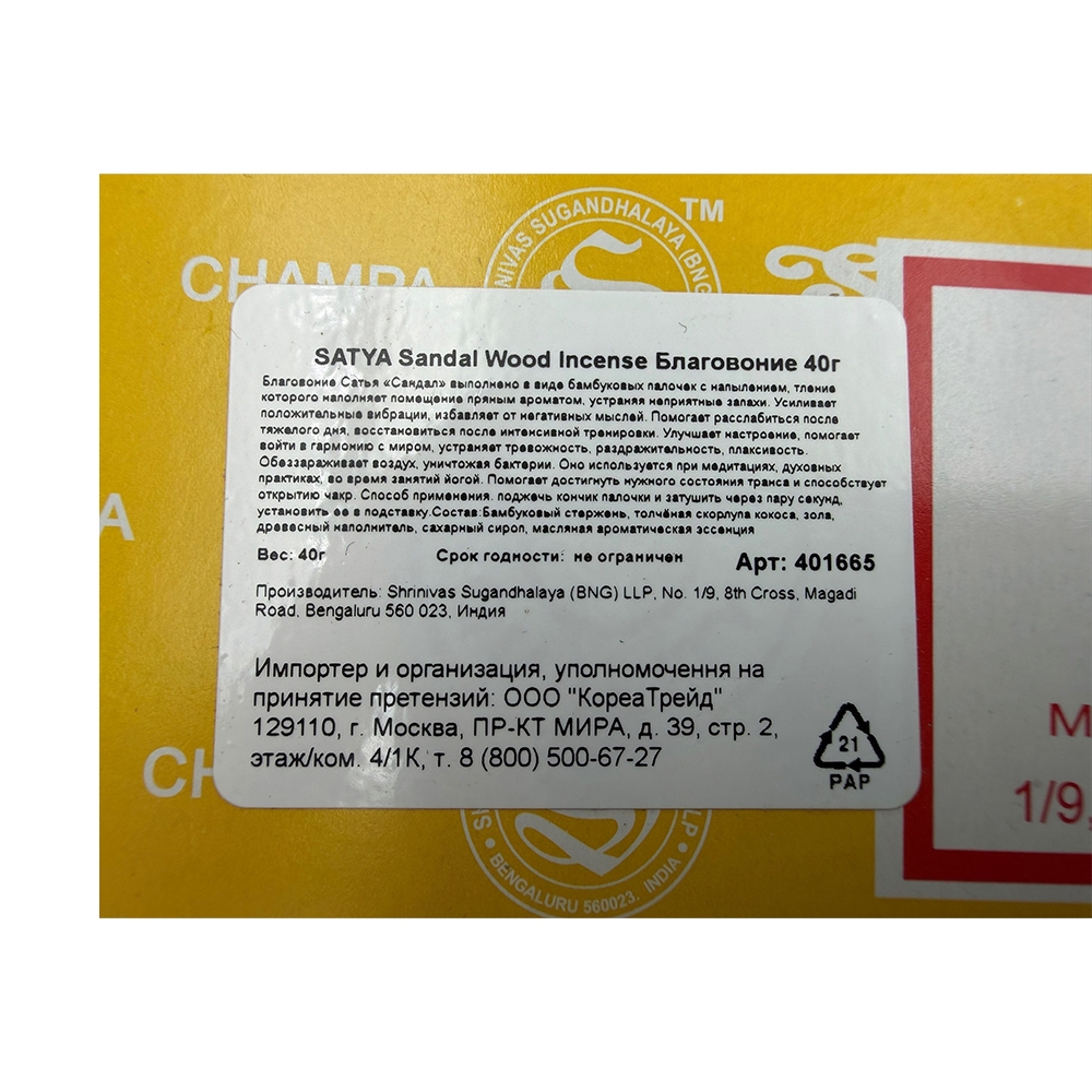 Благовония SATYA Sandal Wood созданы на натуральной основе без древесного угля в составе. Классический сандаловый профиль: сухой, сладковатый и ровный аромат без резких нот.