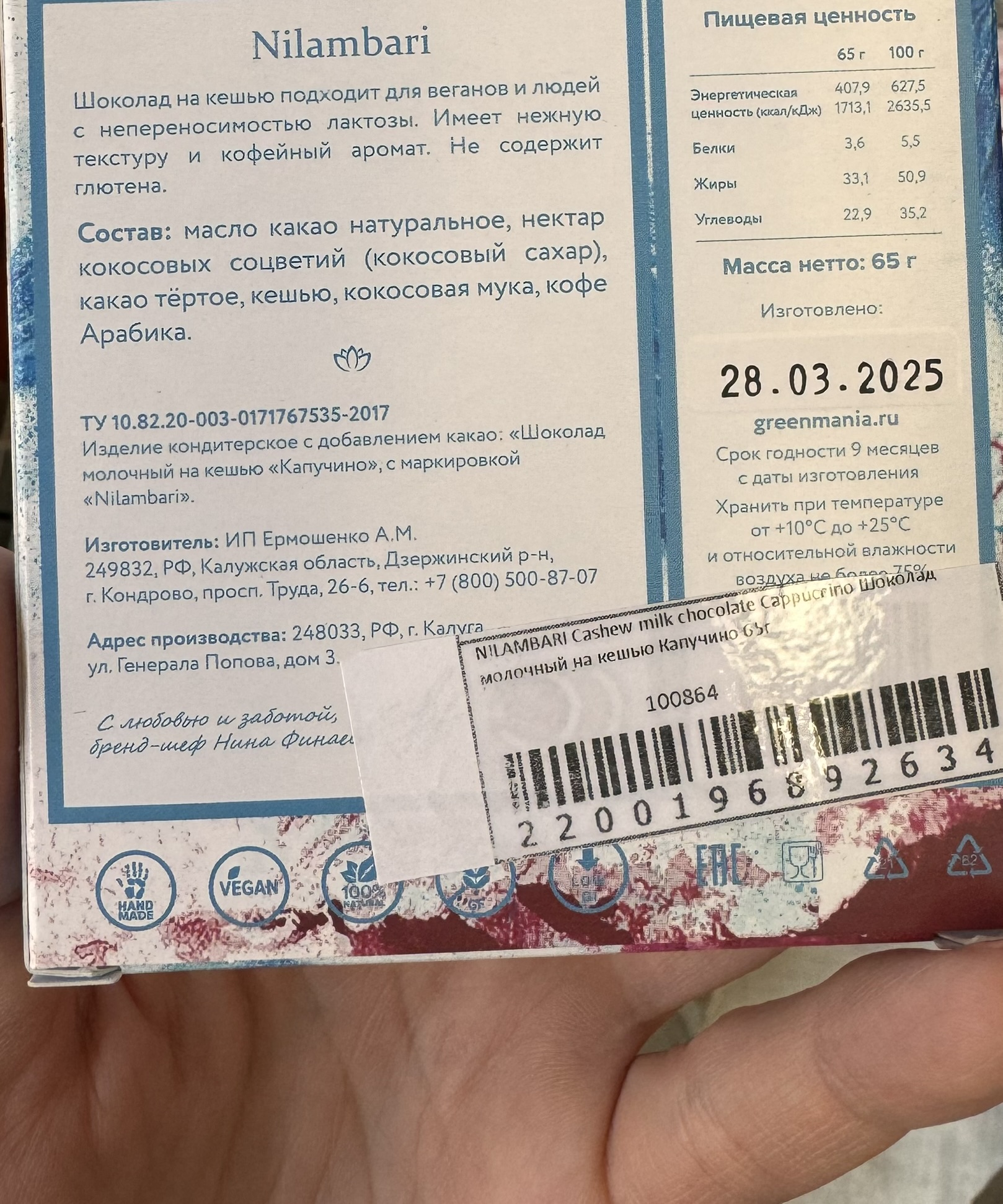 Веганский шоколад «Капучино» содержит натуральное кофе «Арабика», какао, сахар и муку из кокоса, орехи кешью.