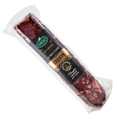 Суджук деликатесный теперь представлен и в веганском варианте. По вкусу и цвету не отличается от своего мясного аналога. Он изготовлена на основе пшеничного белка, с добавлением специй, придающих легкую остринку и нужную пряность, а натуральный ароматизатор обеспечивает нотки копчености.